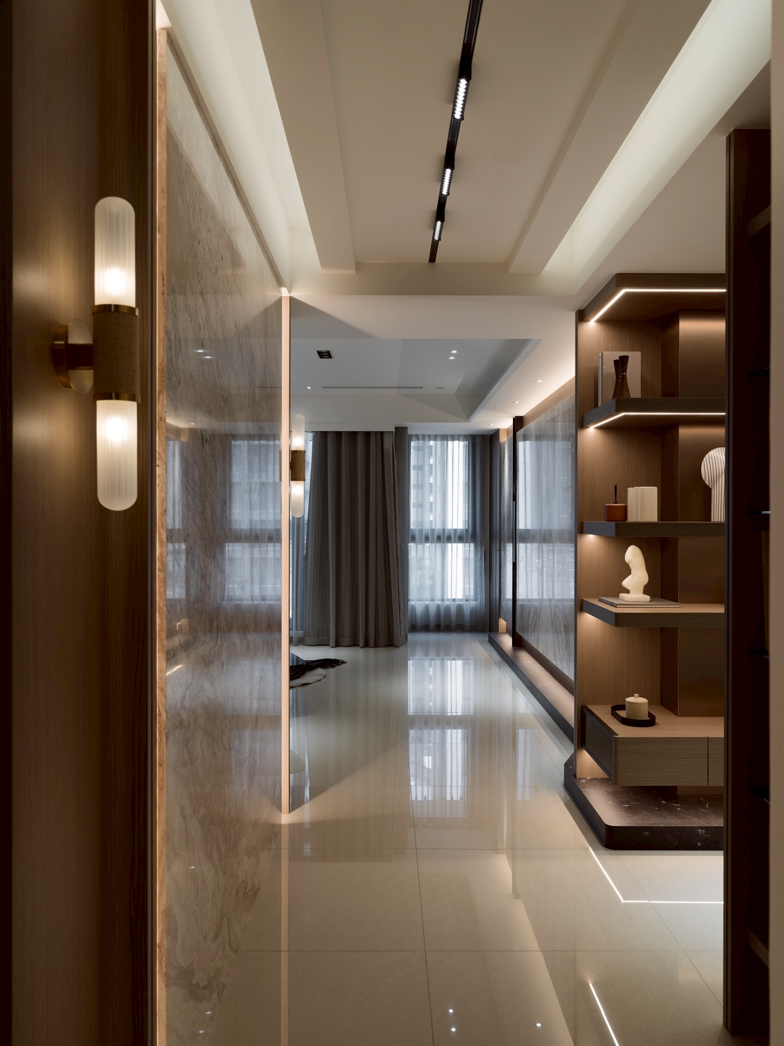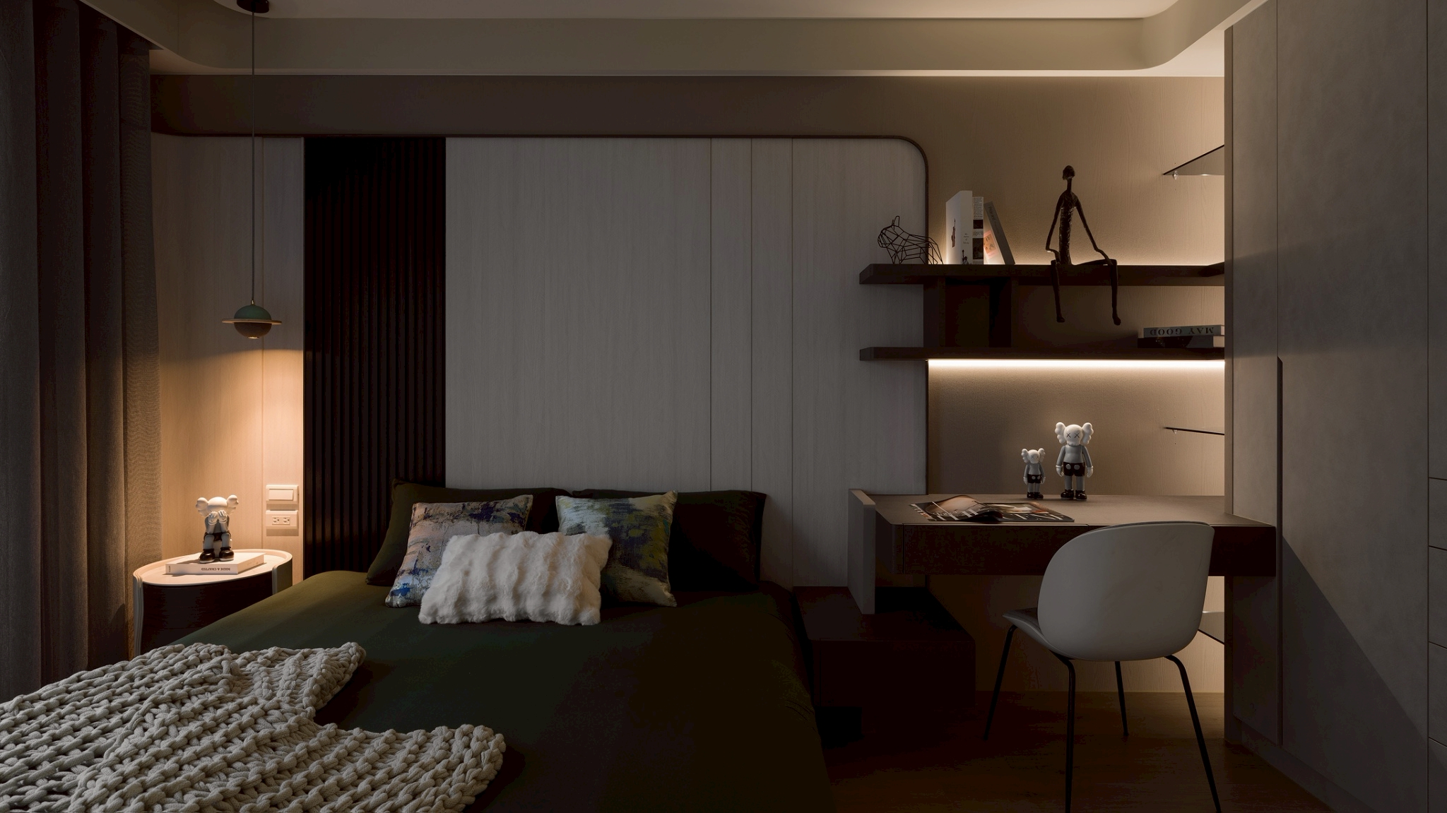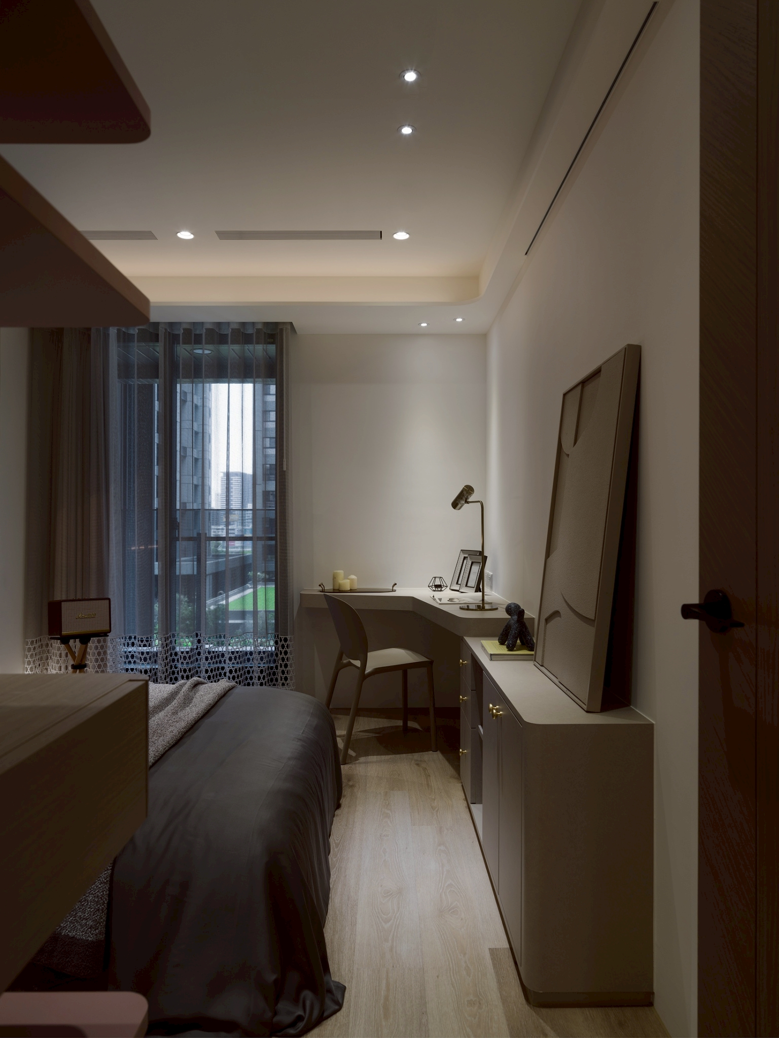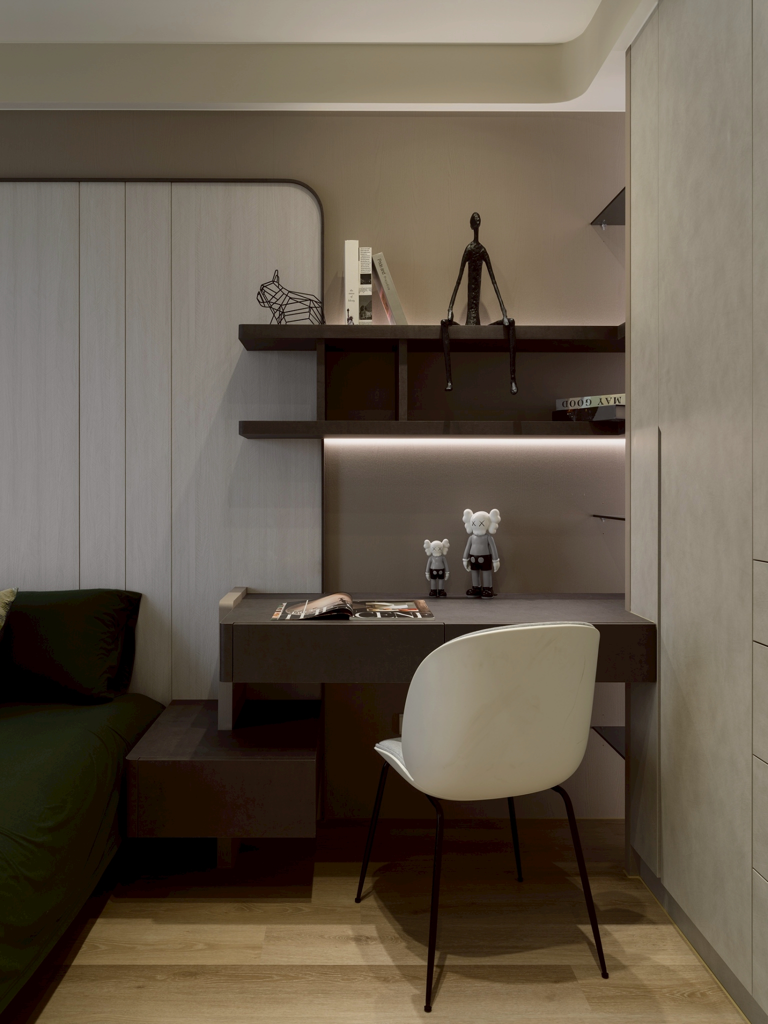 玄關區: 大理石主牆作為視覺焦點,磁吸軌道燈聚焦在大理石紋理 細膩且具藝術性,營造展覽感,而壁燈不只是裝飾,也可作為夜間低照度導引燈,讓玄關在不同時間段都有適合的光氛,提升空間層次與質感。 客餐廳: 電視牆平台延伸至玄關展示櫃,形成一條視覺軸線,讓空間自然過渡,強化整體感。 廚房與客廳半透明的界線-金色鋁框拉門搭配茶色玻璃在不同角度與光源下呈現微妙變化。它既保留空間的隱私性,又讓光線得以穿透,營造出靜謐而不封閉的氛圍。讓廚房與客廳之間有明確分界,維持空間的開放感。 玻璃餐酒櫃讓內部陳列品成為空間的一部分,鋁框則提供結構感與現代俐落的線條。在櫃體內部設置燈條,照亮酒瓶與器皿,營造低調奢華感。 女孩房: 水平嵌燈光條-巧妙地嵌入櫃體中段,不僅提供柔和照明,也打破櫃體的單調線條,增添層次感。隱藏式收納櫃-大量儲物空間整合於牆面,讓視覺保持清爽,符合極簡精神。 書桌與旁邊的櫃體展現出極簡空間中的高機能整合,充分利用使用空間。 男孩房: 床頭板弧形轉角柔化空間的視覺張力,垂直格柵延續至書桌區,形成視覺上的「節奏感」。 書桌緊鄰床鋪,但透過材質與色彩的區隔,劃分出功能性區域。讓空間感更寬闊。