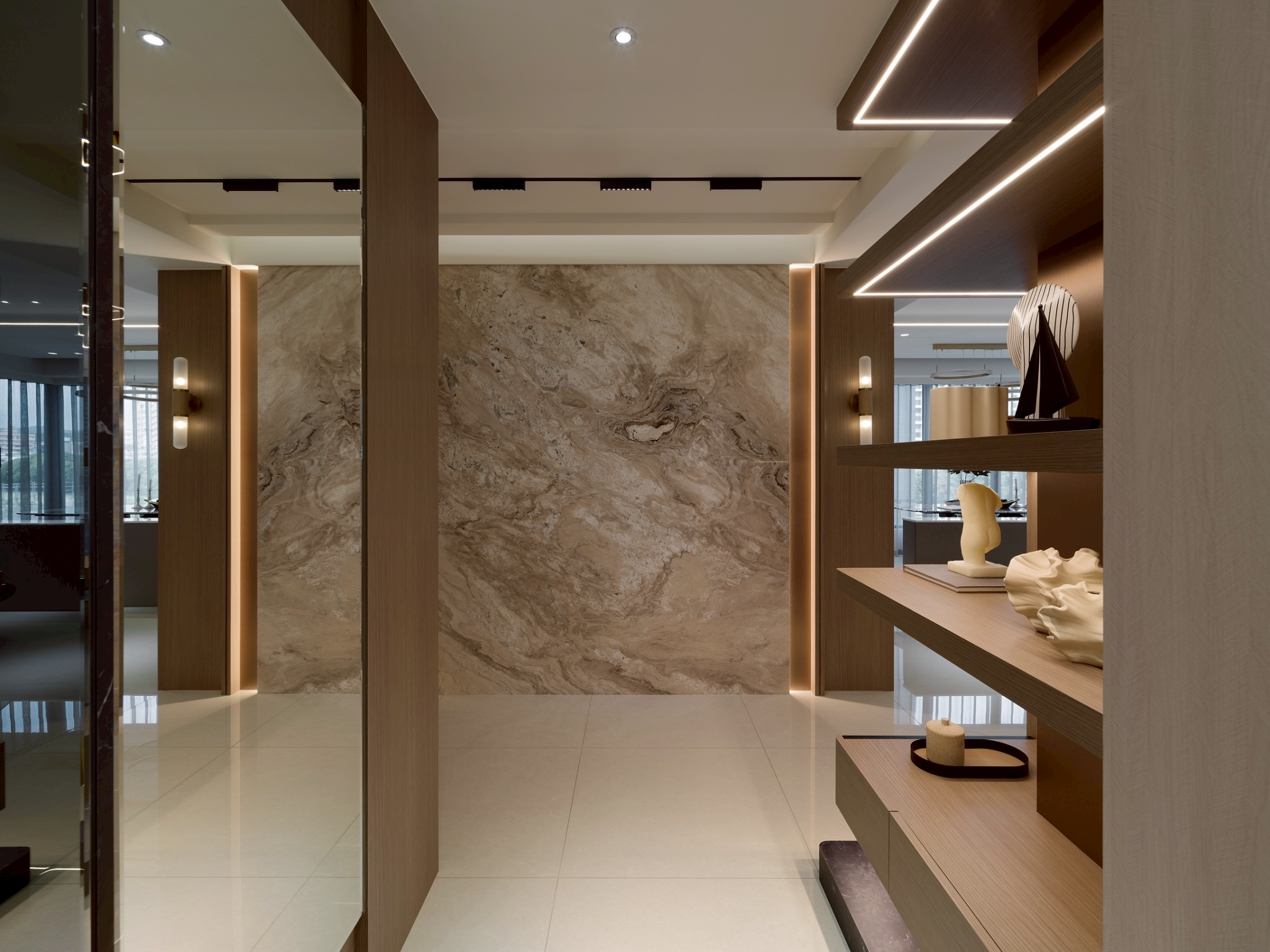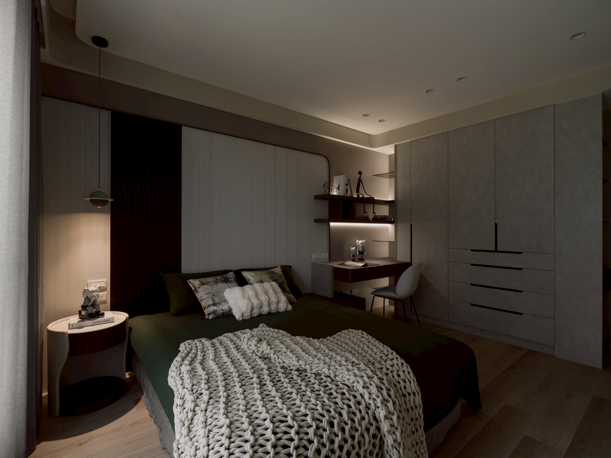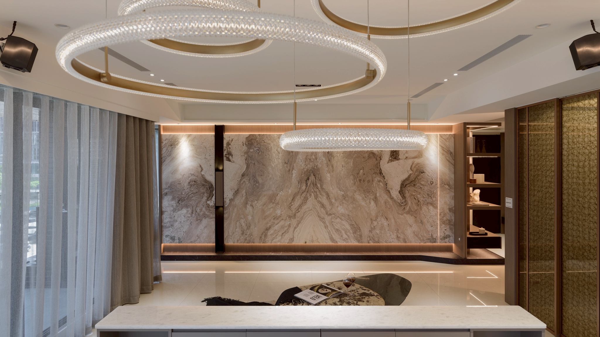 玄關區: 大理石主牆作為視覺焦點,磁吸軌道燈聚焦在大理石紋理 細膩且具藝術性,營造展覽感,而壁燈不只是裝飾,也可作為夜間低照度導引燈,讓玄關在不同時間段都有適合的光氛,提升空間層次與質感。 客餐廳: 電視牆平台延伸至玄關展示櫃,形成一條視覺軸線,讓空間自然過渡,強化整體感。 廚房與客廳半透明的界線-金色鋁框拉門搭配茶色玻璃在不同角度與光源下呈現微妙變化。它既保留空間的隱私性,又讓光線得以穿透,營造出靜謐而不封閉的氛圍。讓廚房與客廳之間有明確分界,維持空間的開放感。 玻璃餐酒櫃讓內部陳列品成為空間的一部分,鋁框則提供結構感與現代俐落的線條。在櫃體內部設置燈條,照亮酒瓶與器皿,營造低調奢華感。 女孩房: 水平嵌燈光條-巧妙地嵌入櫃體中段,不僅提供柔和照明,也打破櫃體的單調線條,增添層次感。隱藏式收納櫃-大量儲物空間整合於牆面,讓視覺保持清爽,符合極簡精神。 書桌與旁邊的櫃體展現出極簡空間中的高機能整合,充分利用使用空間。 男孩房: 床頭板弧形轉角柔化空間的視覺張力,垂直格柵延續至書桌區,形成視覺上的「節奏感」。 書桌緊鄰床鋪,但透過材質與色彩的區隔,劃分出功能性區域。讓空間感更寬闊。