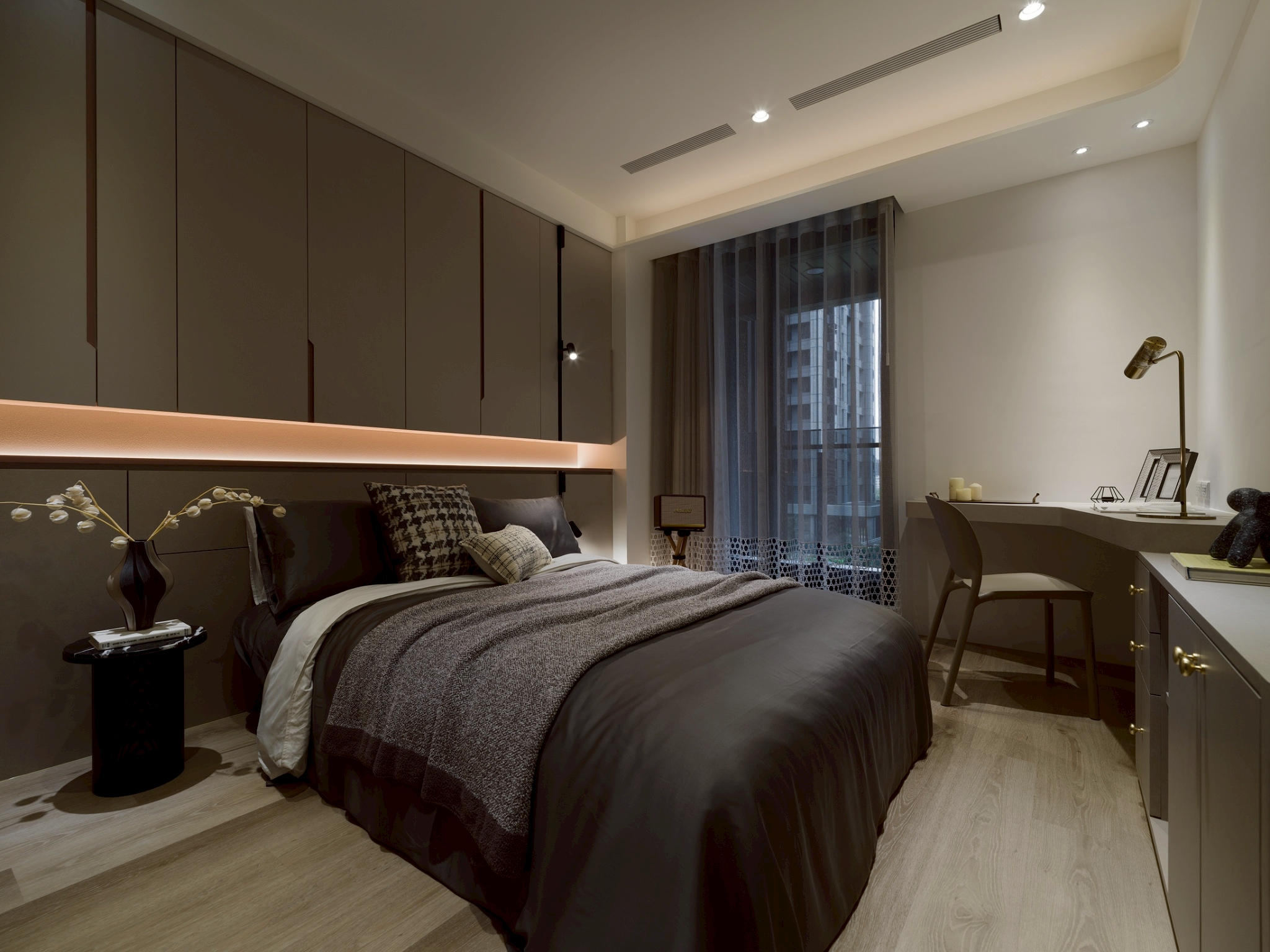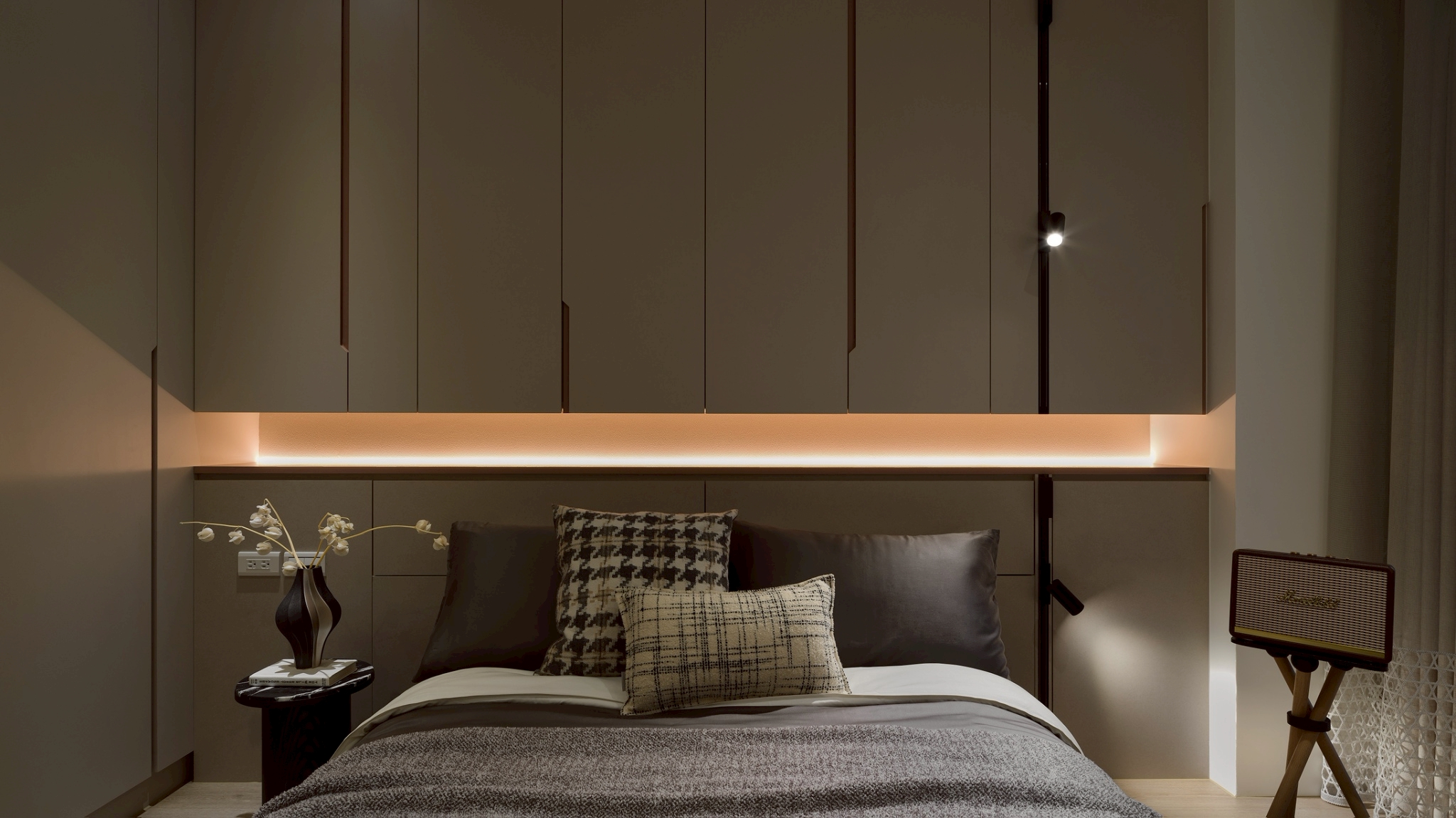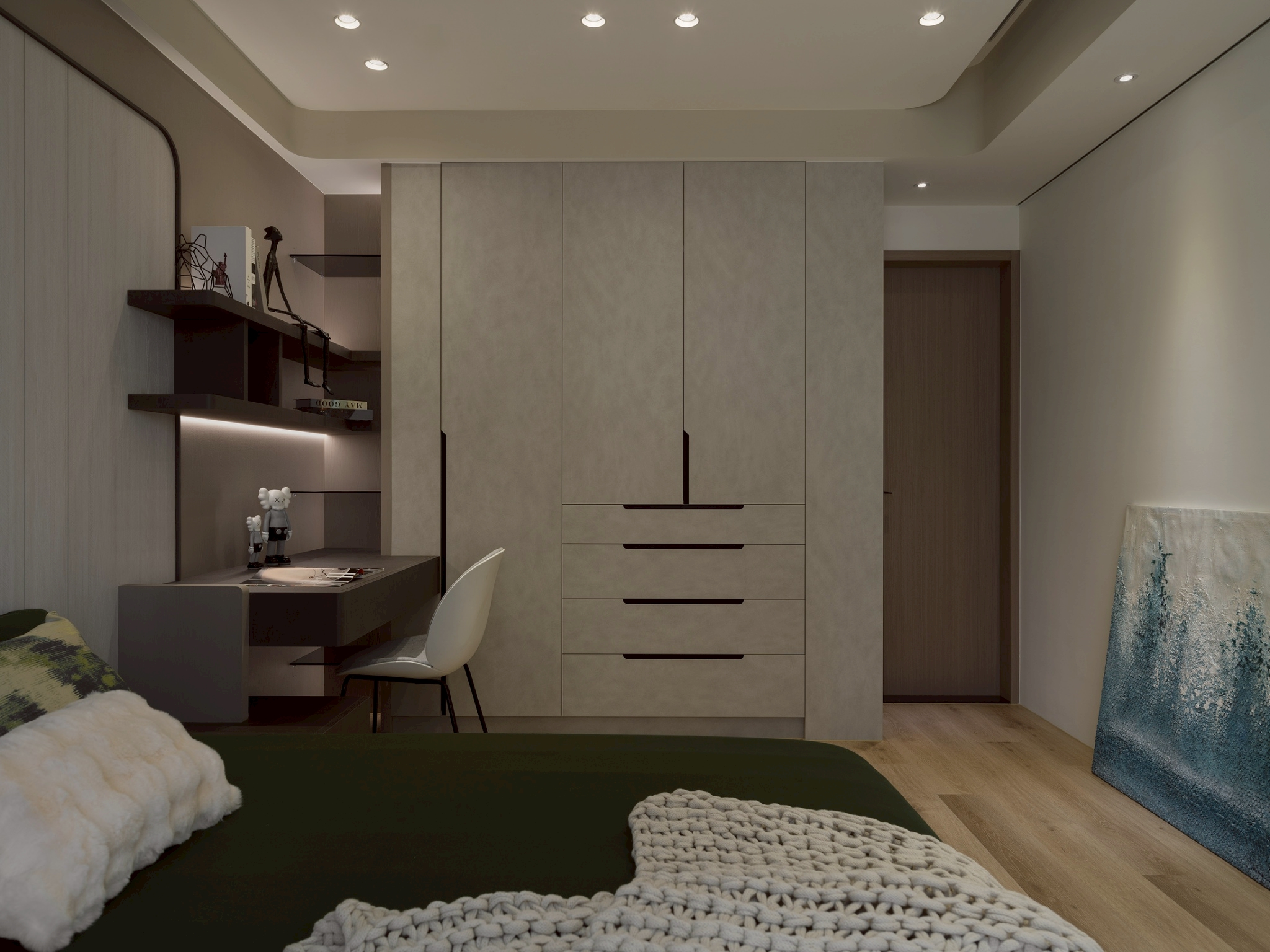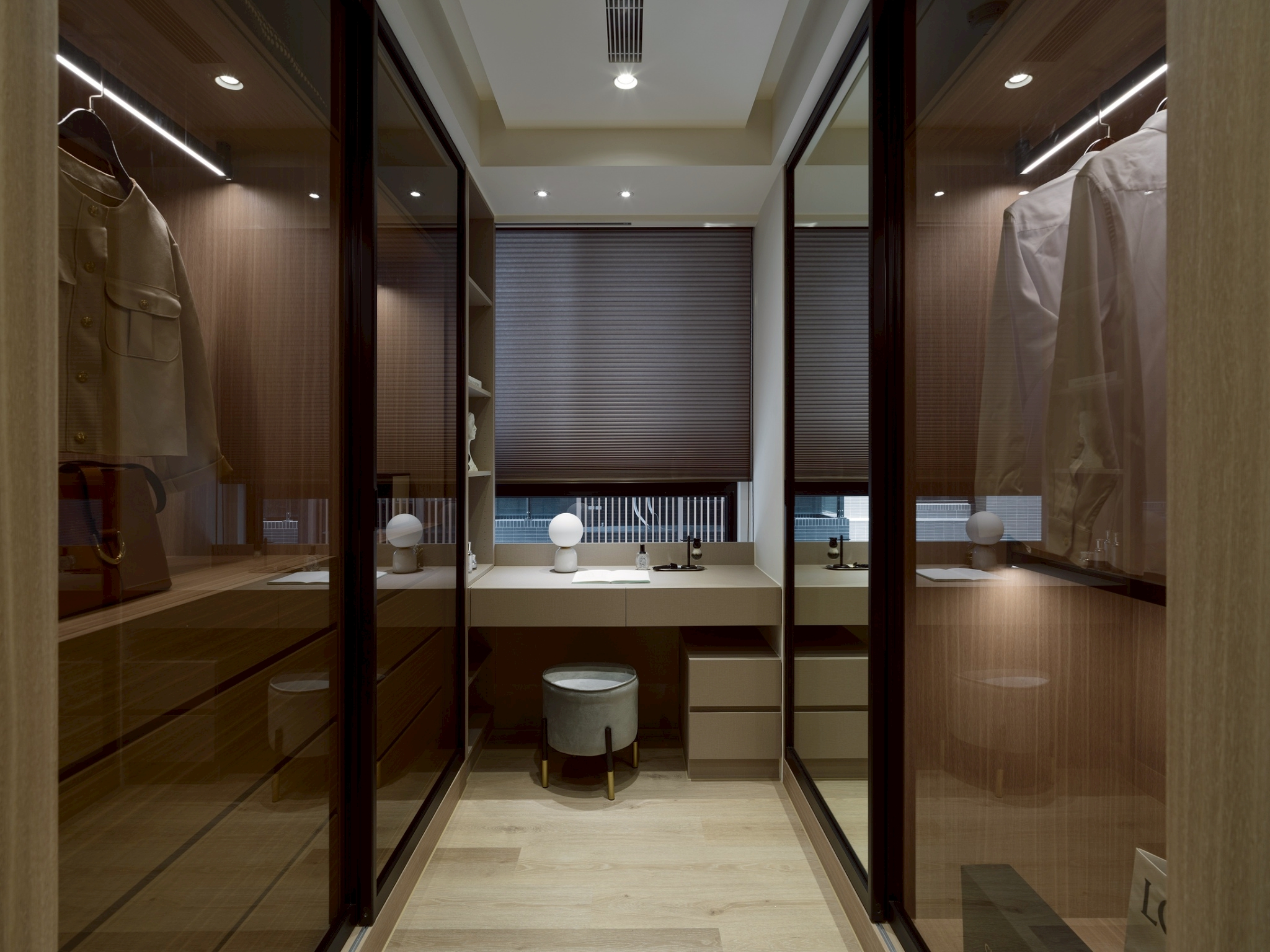 玄關區: 大理石主牆作為視覺焦點,磁吸軌道燈聚焦在大理石紋理 細膩且具藝術性,營造展覽感,而壁燈不只是裝飾,也可作為夜間低照度導引燈,讓玄關在不同時間段都有適合的光氛,提升空間層次與質感。 客餐廳: 電視牆平台延伸至玄關展示櫃,形成一條視覺軸線,讓空間自然過渡,強化整體感。 廚房與客廳半透明的界線-金色鋁框拉門搭配茶色玻璃在不同角度與光源下呈現微妙變化。它既保留空間的隱私性,又讓光線得以穿透,營造出靜謐而不封閉的氛圍。讓廚房與客廳之間有明確分界,維持空間的開放感。 玻璃餐酒櫃讓內部陳列品成為空間的一部分,鋁框則提供結構感與現代俐落的線條。在櫃體內部設置燈條,照亮酒瓶與器皿,營造低調奢華感。 女孩房: 水平嵌燈光條-巧妙地嵌入櫃體中段,不僅提供柔和照明,也打破櫃體的單調線條,增添層次感。隱藏式收納櫃-大量儲物空間整合於牆面,讓視覺保持清爽,符合極簡精神。 書桌與旁邊的櫃體展現出極簡空間中的高機能整合,充分利用使用空間。 男孩房: 床頭板弧形轉角柔化空間的視覺張力,垂直格柵延續至書桌區,形成視覺上的「節奏感」。 書桌緊鄰床鋪,但透過材質與色彩的區隔,劃分出功能性區域。讓空間感更寬闊。