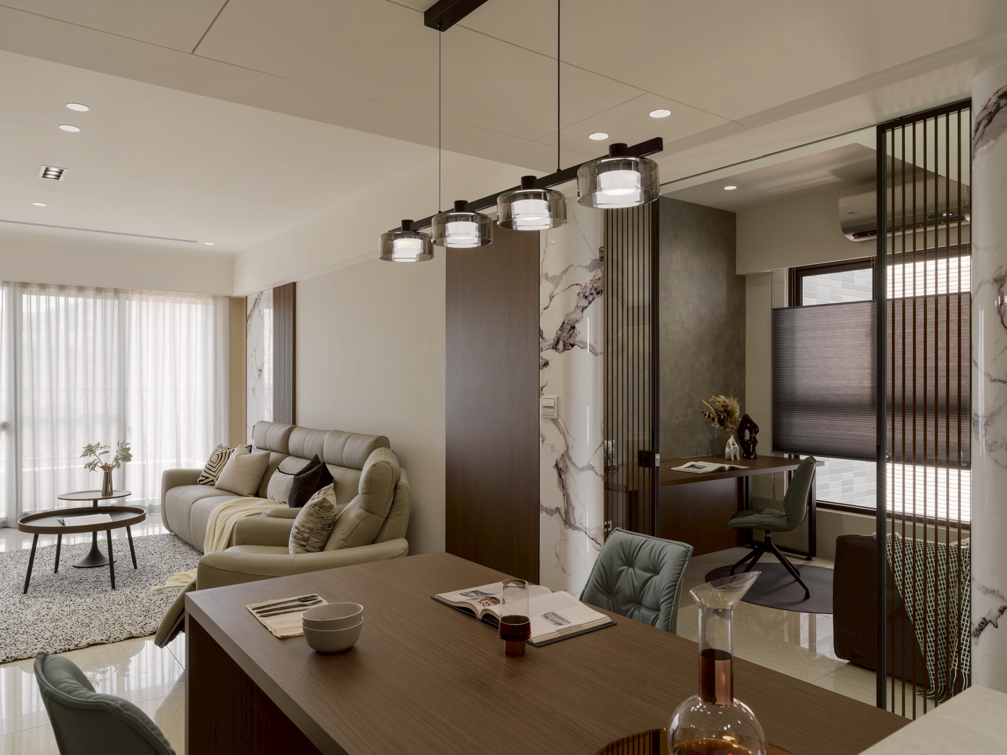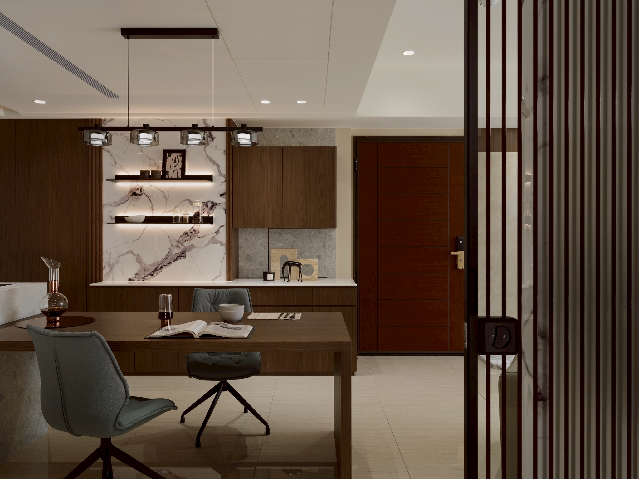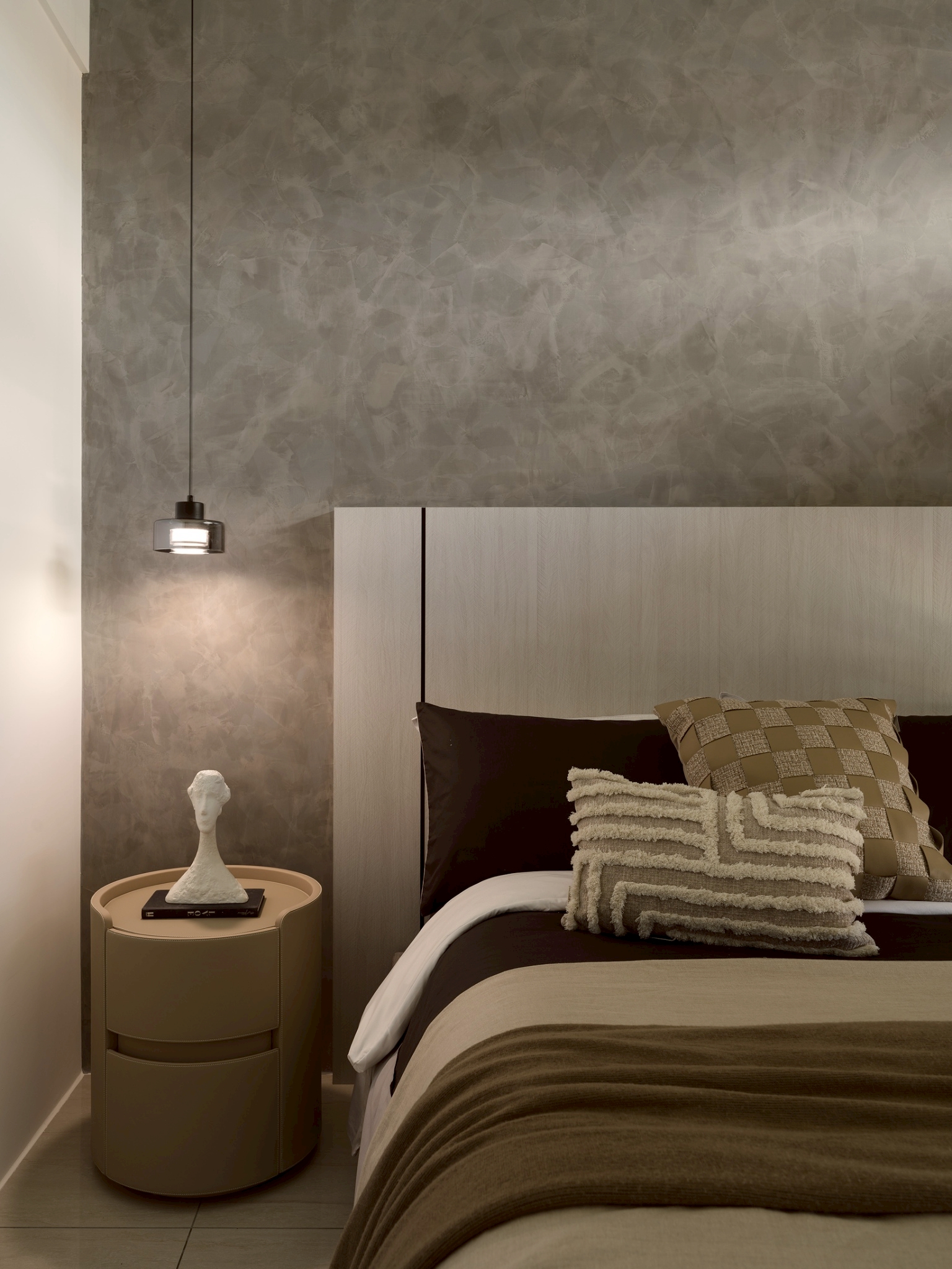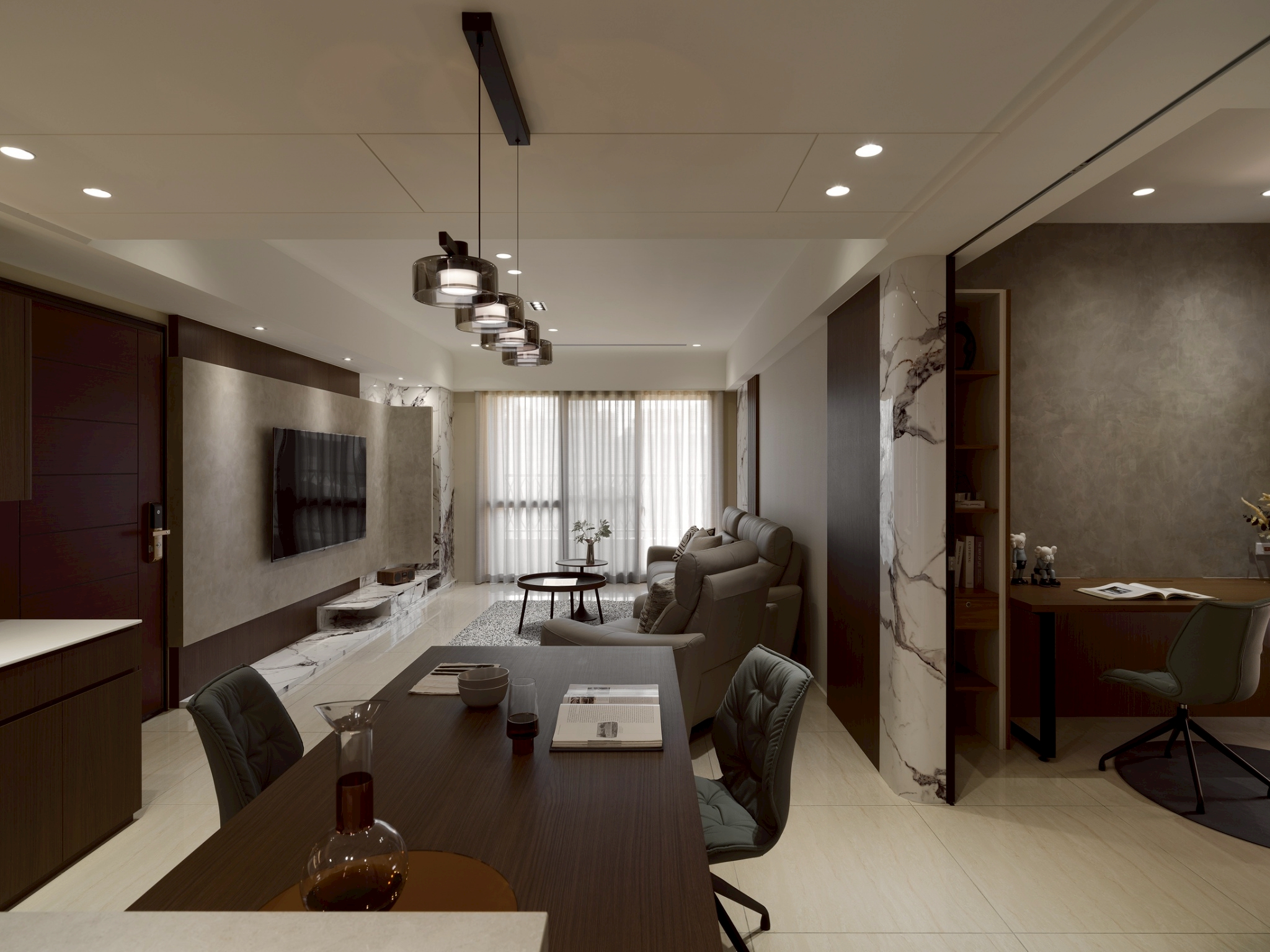 公領域: 牆面以霧灰形成層次堆疊,以弧形包覆電視,營造出包容、流動的空間感讓電視牆不只是背景,透過材質、色彩與弧形構圖,講述一種「靜中有動、簡中有層」的空間哲學。 半開放式工作區與閱讀區延續客餐廳設計,整體色調以木質暖棕色為主,而灰白大理石紋理增添冷靜與精緻感,平衡木材的溫度,營造沉穩且不壓迫的氛圍。 私領域: 臥室A: 利用格柵凹凸線條遮蔽門縫和灰白大理石紋理將門片巧妙融入,讓門「消失」在視覺中,達到空間整合與美感提升的效果。 床頭櫃一體化設計-將床頭櫃融入牆面櫥櫃中,節省空間並維持整體視覺一致性。 工作區與臥室相連,空間融合但透過材質與色彩區隔,保持功能獨立。 臥室B: 臥室牆面礦物塗料帶有微細紋理與霧面質地,在自然光下呈現細膩的光影變化,提升空間的層次與手工感。床頭融合牆面,即具藝術性維持極簡純粹。 衣櫃深色造型線條在淺木面板間形成節奏感,視覺上拉高空間比例,提升空間層次與視覺焦點。