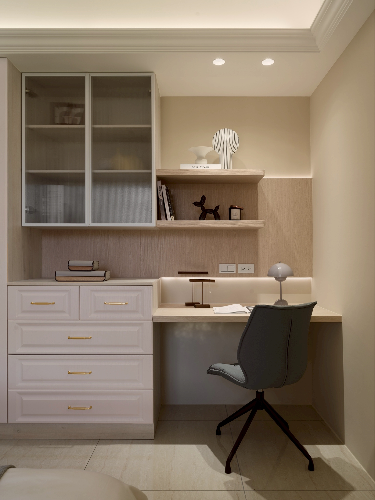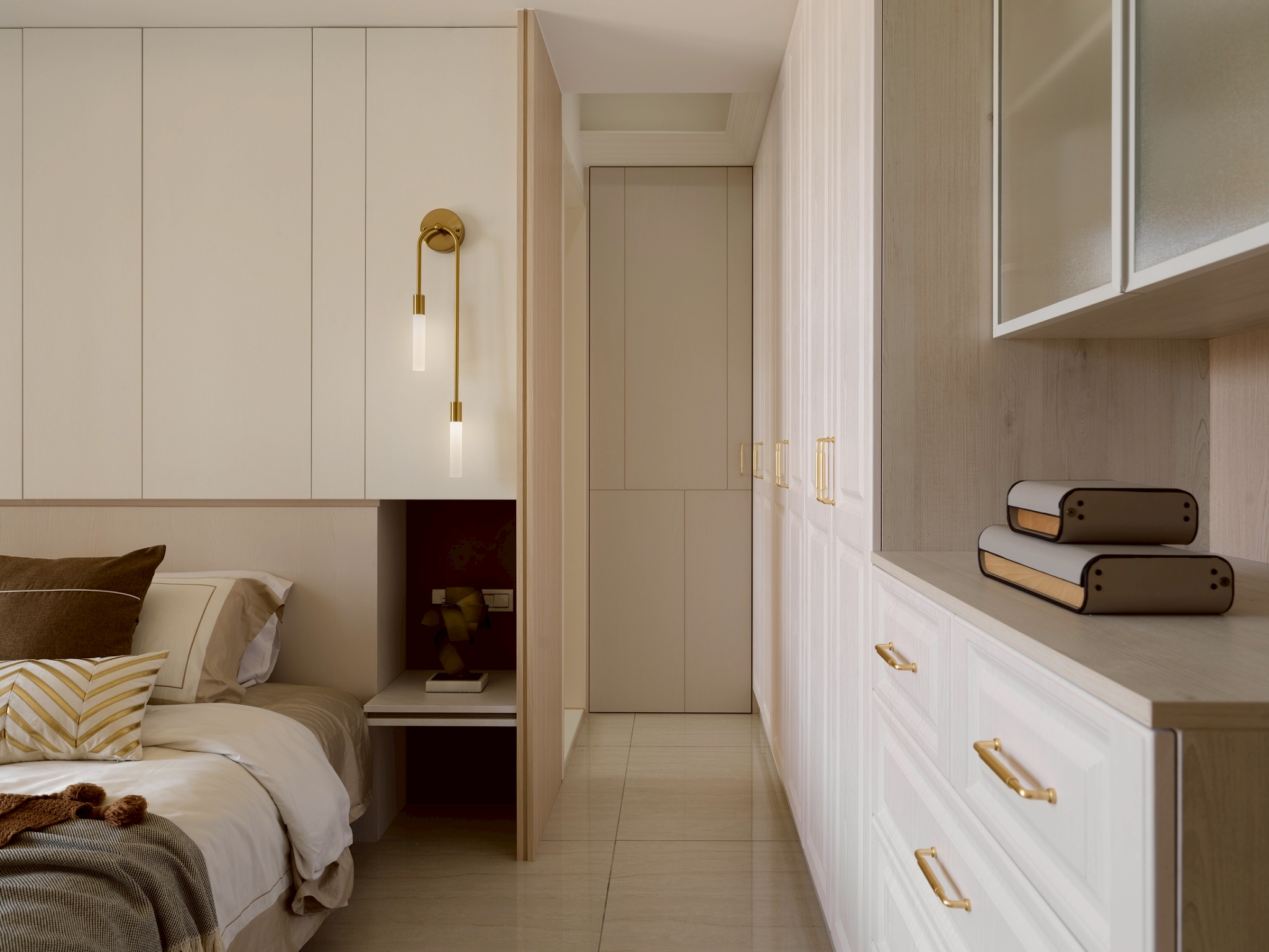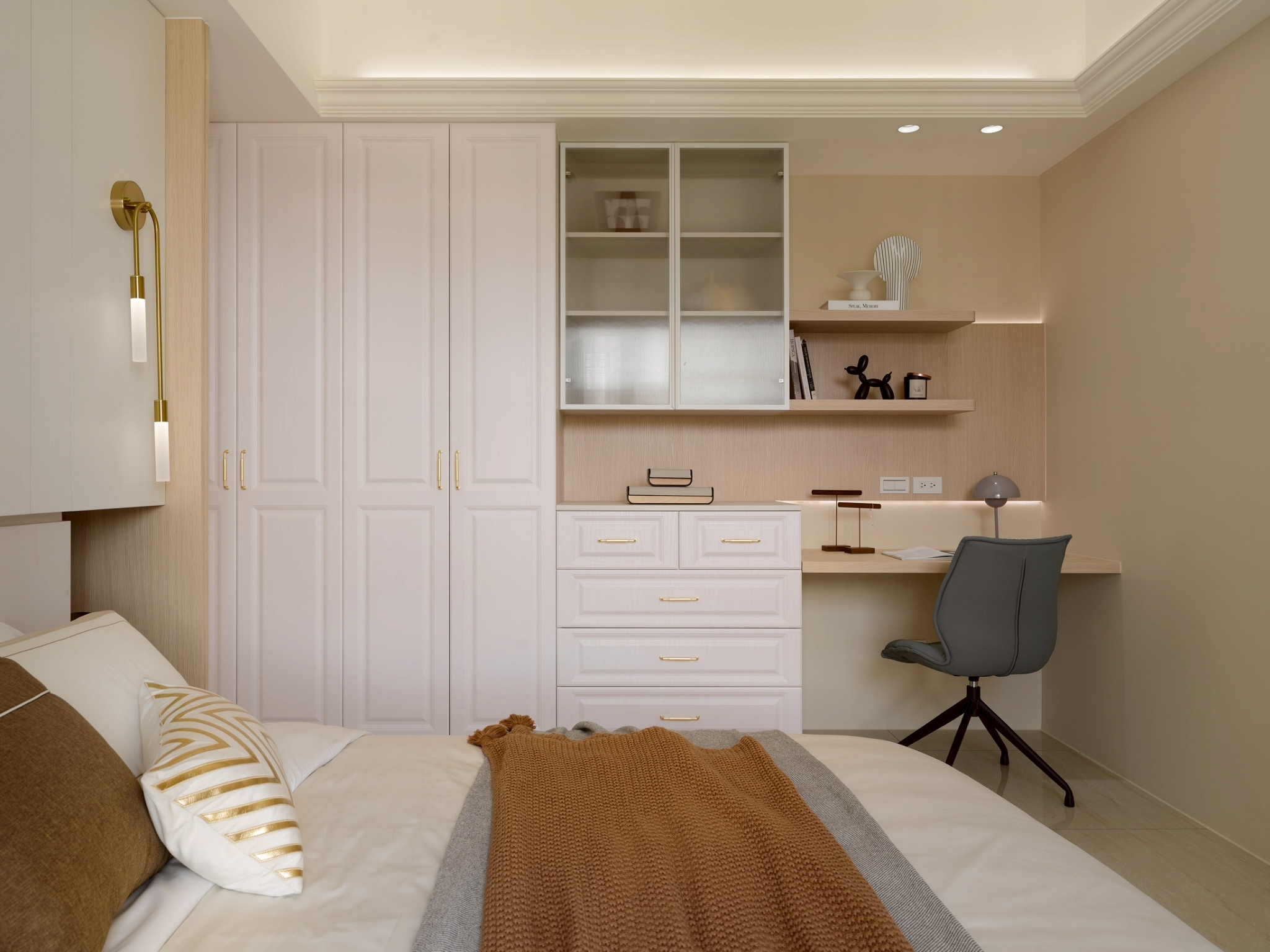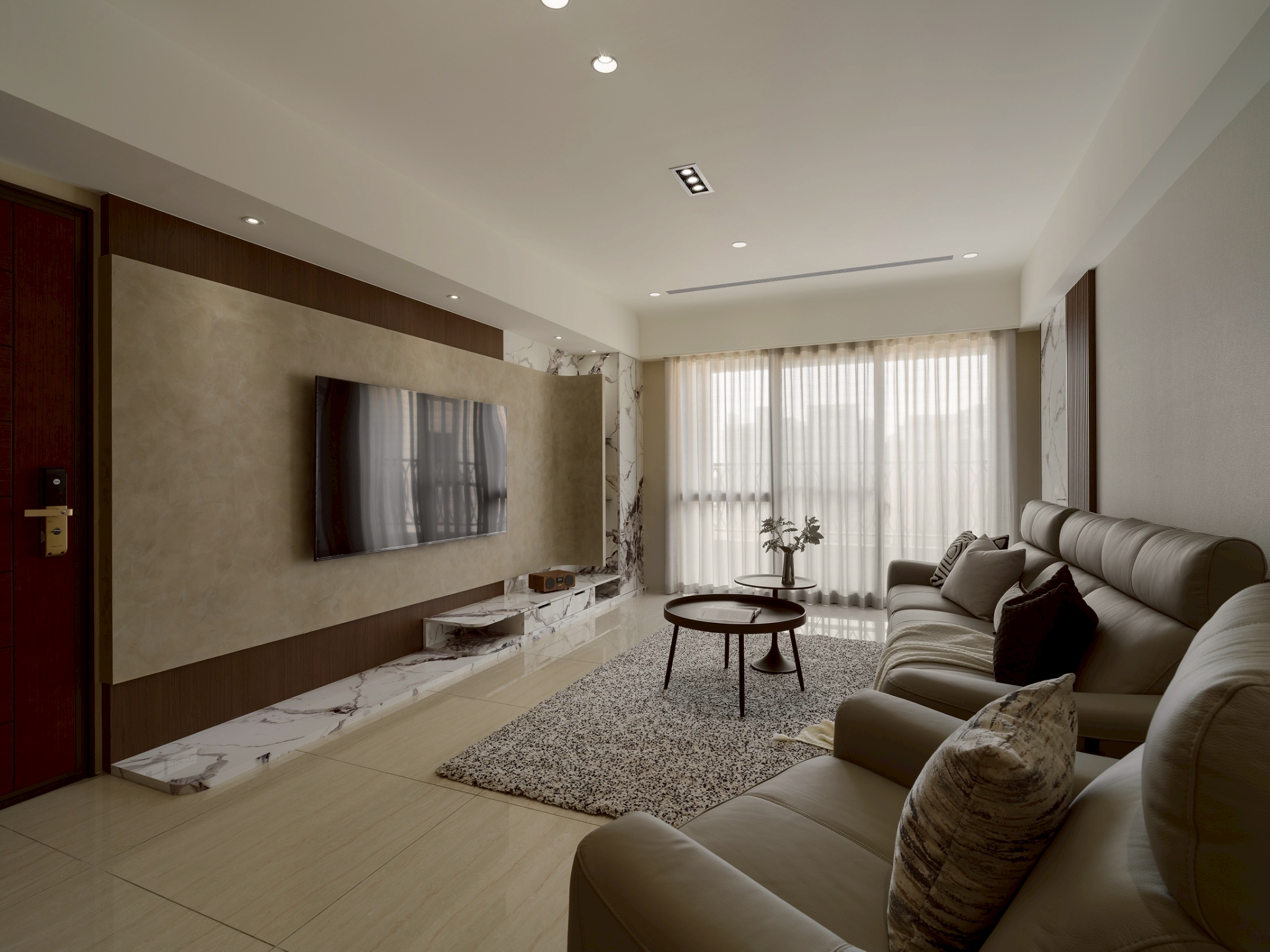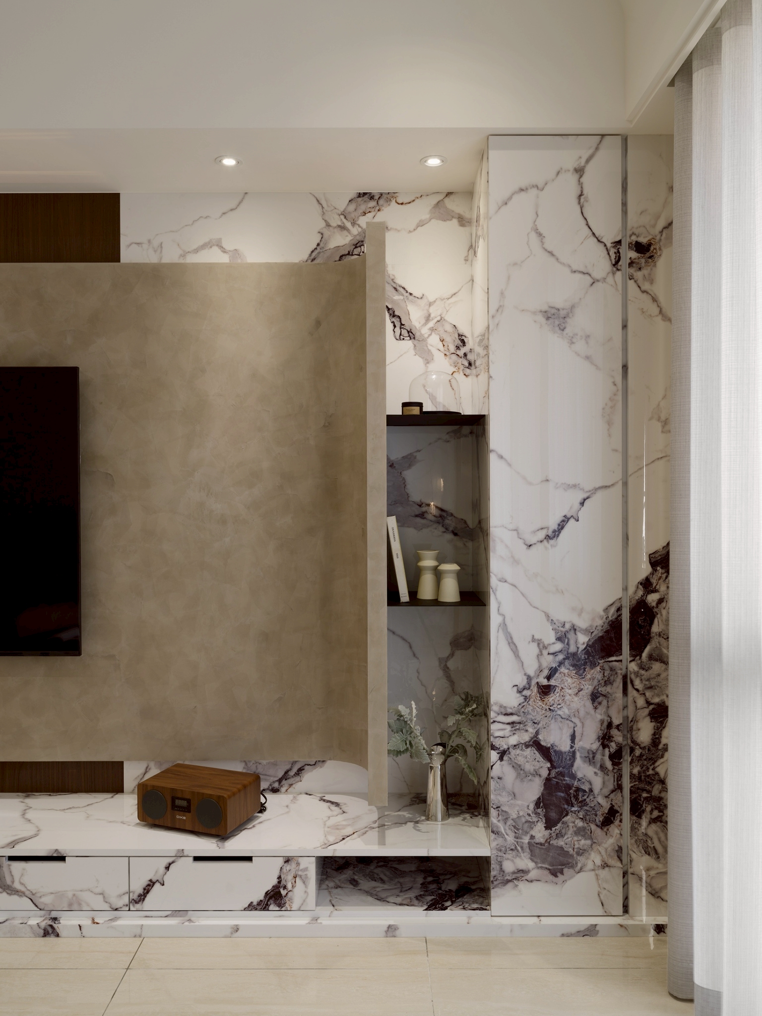 公領域: 牆面以霧灰形成層次堆疊,以弧形包覆電視,營造出包容、流動的空間感讓電視牆不只是背景,透過材質、色彩與弧形構圖,講述一種「靜中有動、簡中有層」的空間哲學。 半開放式工作區與閱讀區延續客餐廳設計,整體色調以木質暖棕色為主,而灰白大理石紋理增添冷靜與精緻感,平衡木材的溫度,營造沉穩且不壓迫的氛圍。 私領域: 臥室A: 利用格柵凹凸線條遮蔽門縫和灰白大理石紋理將門片巧妙融入,讓門「消失」在視覺中,達到空間整合與美感提升的效果。 床頭櫃一體化設計-將床頭櫃融入牆面櫥櫃中,節省空間並維持整體視覺一致性。 工作區與臥室相連,空間融合但透過材質與色彩區隔,保持功能獨立。 臥室B: 臥室牆面礦物塗料帶有微細紋理與霧面質地,在自然光下呈現細膩的光影變化,提升空間的層次與手工感。床頭融合牆面,即具藝術性維持極簡純粹。 衣櫃深色造型線條在淺木面板間形成節奏感,視覺上拉高空間比例,提升空間層次與視覺焦點。