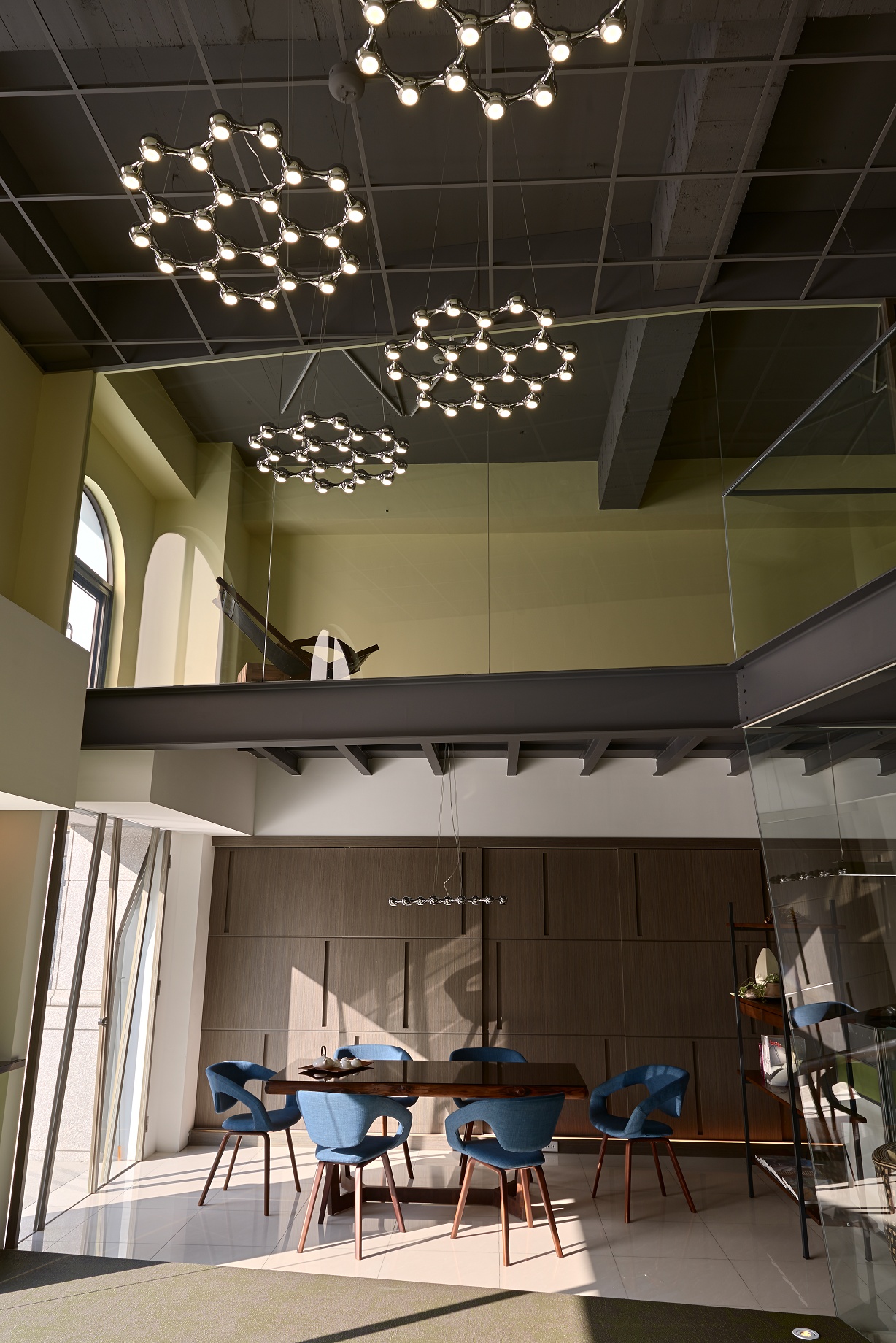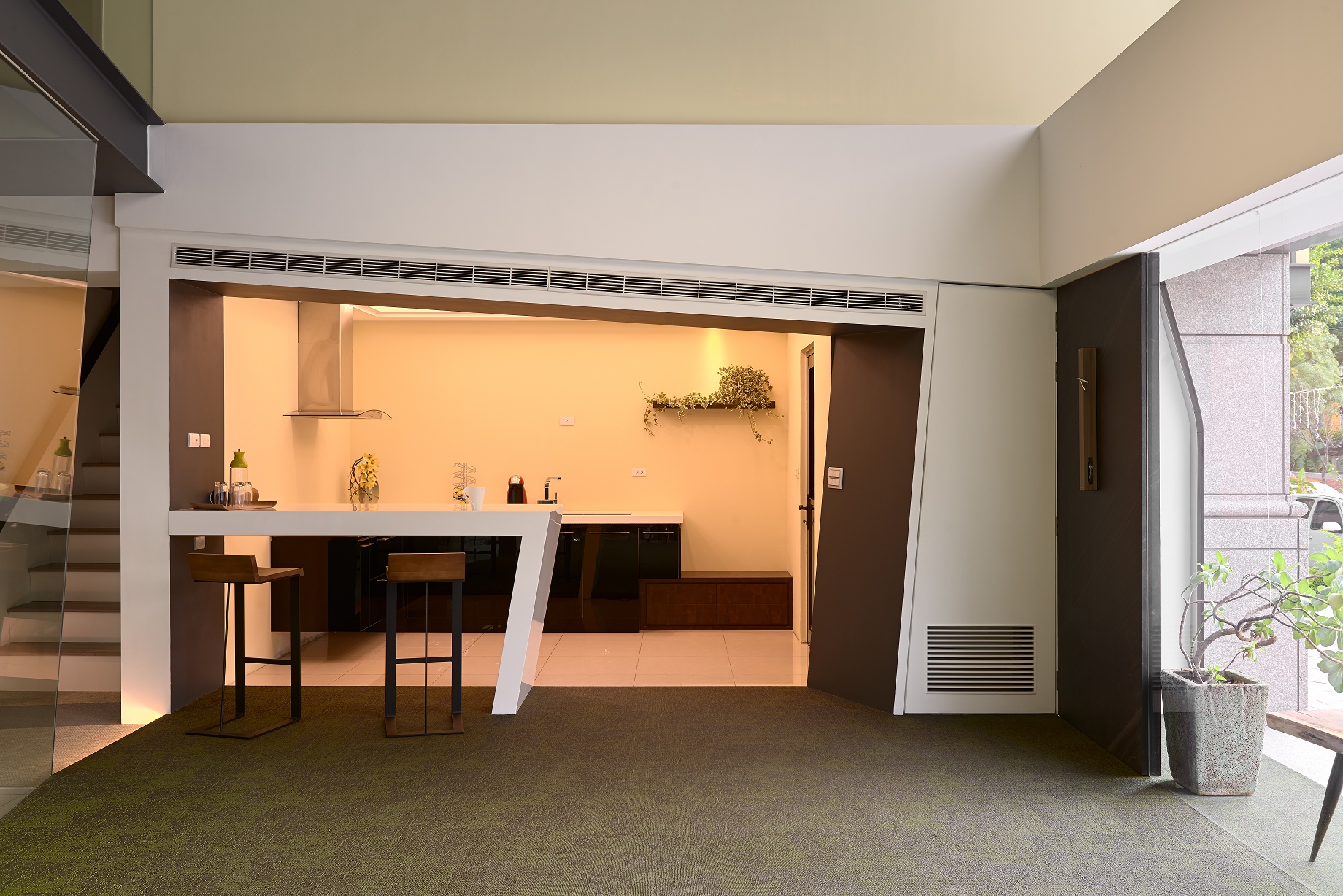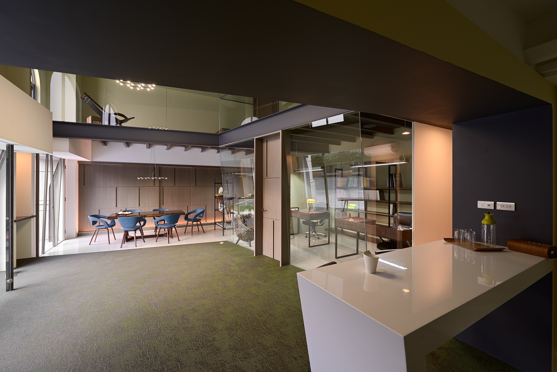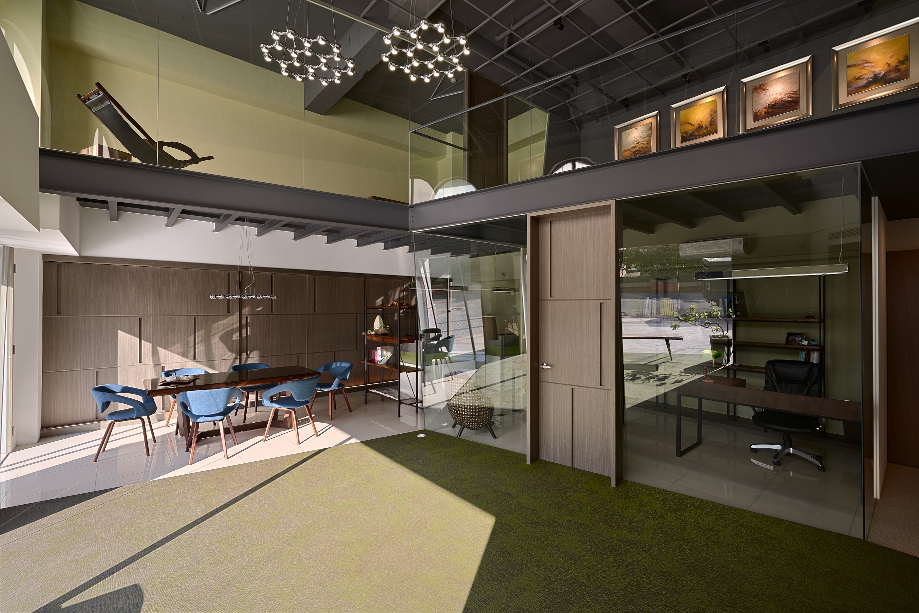 這間 60 坪的現代風空間,是設計師的明亮辦公室,室內以簡潔的幾何線條,構築時尚前衛的空間形象。入口處藉由一整片綠色地坪,界定通往各個區塊的動線。設計師於開放式的茶水間,透過大的尖角框架,包含吧檯的小尖角,塑造富有趣味的立面視覺。採光良好的會議空間,利用溫暖的木紋,修飾整牆收納櫃,並藉由展示鐵件分隔辦公領域。主管的辦公室採取玻璃隔間,打造敞亮的環境氛圍,且運用門板和木桌的位置,形成對稱的和諧感受。樓上則藉著鏤空的格狀天花,降低整體的壓迫感,創造宛如藝廊般的輕鬆雅致。 內容來源:設計作品_雋築空間設計_劉倢妤_室內設計師-設計家
