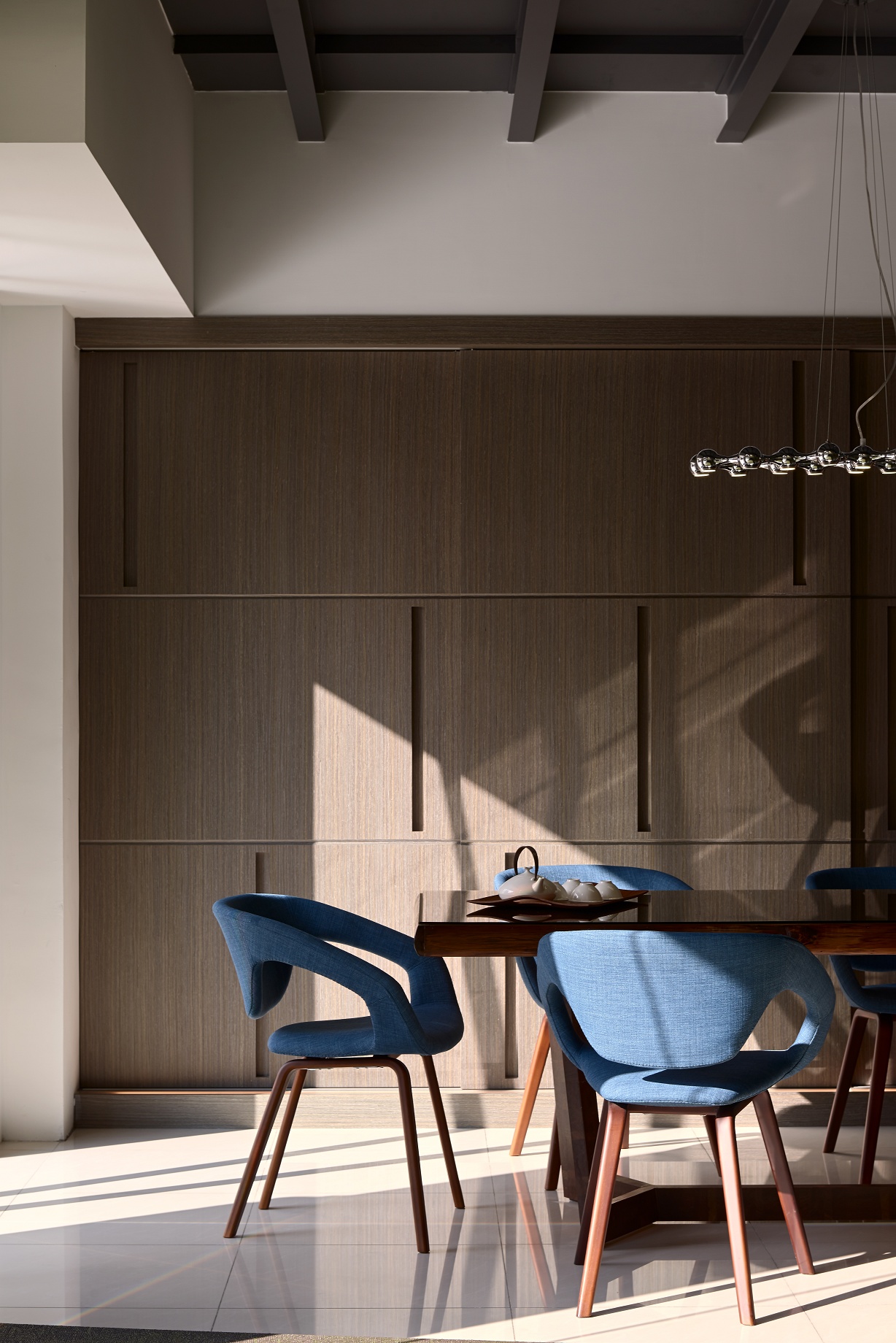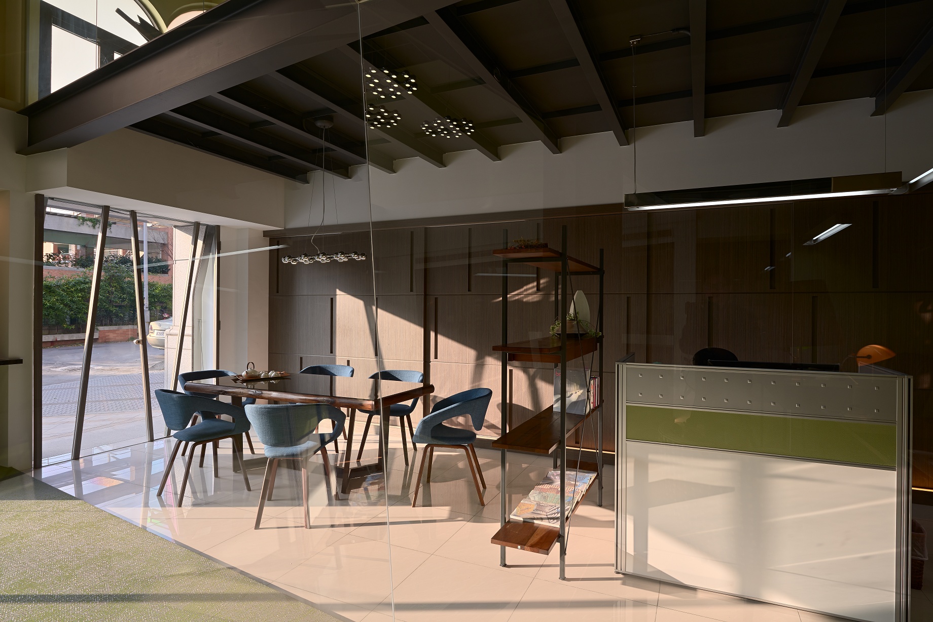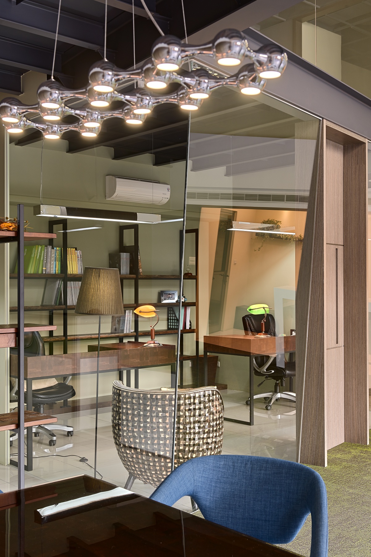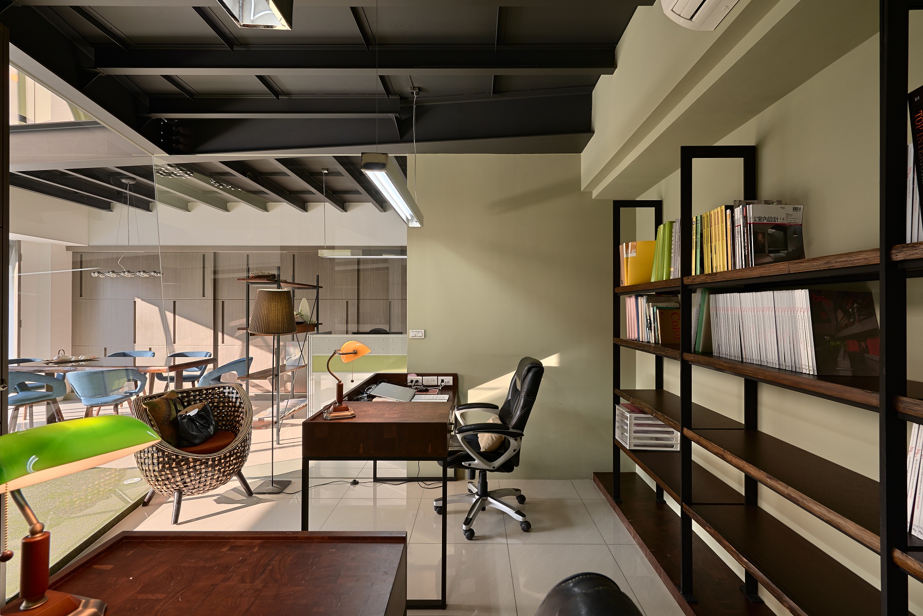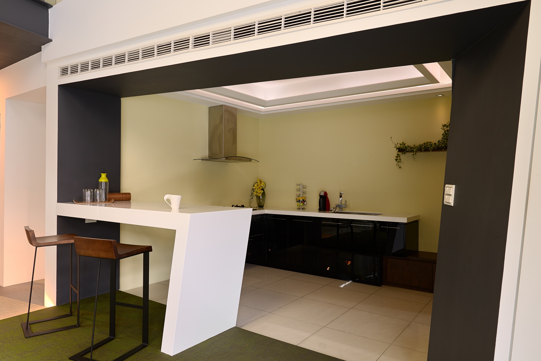 這間 60 坪的現代風空間,是設計師的明亮辦公室,室內以簡潔的幾何線條,構築時尚前衛的空間形象。入口處藉由一整片綠色地坪,界定通往各個區塊的動線。設計師於開放式的茶水間,透過大的尖角框架,包含吧檯的小尖角,塑造富有趣味的立面視覺。採光良好的會議空間,利用溫暖的木紋,修飾整牆收納櫃,並藉由展示鐵件分隔辦公領域。主管的辦公室採取玻璃隔間,打造敞亮的環境氛圍,且運用門板和木桌的位置,形成對稱的和諧感受。樓上則藉著鏤空的格狀天花,降低整體的壓迫感,創造宛如藝廊般的輕鬆雅致。 內容來源:設計作品_雋築空間設計_劉倢妤_室內設計師-設計家